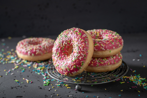 Exquisita dona con un delicioso relleno de fresa fresca. Disfruta de su masa esponjosa y el dulce sabor de la fresa en cada mordisco. Una tentación frutal que te cautivará desde el primer bocado.